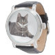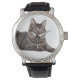 Retrato de un gato con una rayas grises sentado sobre un fondo blanco
