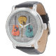 Reloj de pulsera para un guitarrista de diseño rústico. Fondo de madera de granero gris con tres imágenes acústicas de guitarra en naranja, amarillo y azul. Los números blancos alrededor del borde y las selecciones de banda para el personalizar como desee. Este reloj masculino es la elección perfecta para cualquier músico o amante de la música.