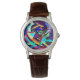 La imagen muestra a una bruja surfeando en una onda mágica y vibrante mientras toca una guitarra eléctrica. Lleva puesto a una gorra de gran tamaño, con el cabello ondulado y multicolor cayendo por sus hombros. La bruja se coloca dinámicamente, balanceándose elegantemente en una tabla de surf que atraviesa una explosión de colores y energía. El trabajo se realiza en un estilo artístico pop atrevido y psicodélico, con un uso sorprendente de colores vivos y saturados. Las olas que la rodean están pintadas en tonos azules, rosas, amarillos y verdes, dando un sentido de movimiento y fluidez. El fondo contrasta con el morado profundo y el blues, haciendo que la bruja y su mágica tabla de surf se destaquen dramáticamente. Este artículo combina elementos de fantasía, música y cultura del surf, creando una escena visualmente cautivadora que se siente energética y surrealista. El uso de líneas nítidas, colores contrastantes y composición dinámica genera una sensación de emoción y otra aventura en el mundo. Tiene el texto de personalizable 'Be Enchanted'. La resolución es de 5984x5984 ppi.