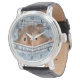 Sable marrón de pelo largo cara de hámster asomando de jeans azules reloj de pulsera de bolsillo