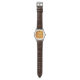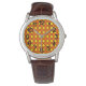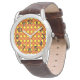 Este reloj masculino tiene un diseño de los años 70 de diamantes amarillos sólidos dentro de contornos de diamante marrón en un campo de naranja.