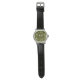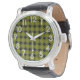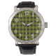 Este reloj masculino tiene un diseño moderno de mediados de siglo de diamantes negros sólidos dentro de los contornos de diamante negro en un campo de verde.