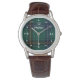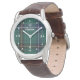 Elegante reloj de pulsera de correa de cuero, con el clásico patrón verde azulado de trenzado Henderson tartan, en la cara, con números blancos y puntos durante las horas. El texto del personalizado blanco lee Henderson y se puede personalizar para leer lo que se desea.