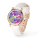 Un elegante reloj de oro rosa con un hermoso diseño abstracto rojo, azul y rosa liquidado. Este reloj de bonito incluye una elegante pulsera de cuero blanco. La cara del reloj tiene un mensaje de texto. El texto y las fotos son personalizables, y se pueden personalizar fácilmente para adaptarlas a sus necesidades. Este reloj único y hermoso es el mejor regalo para tu esposa, novia y mamá. ¡Un gran regalo para el cumpleaños, el boda, el aniversario, las vacaciones, el día de San Valentín, el día de la madre y para ti mismo! Una joyería verdaderamente única, que hará que cualquier mujer se sienta amada y especial!