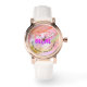 Un elegante reloj de oro rosa con un hermoso diseño abstracto rosado y liquidado. Este reloj de bonito incluye una elegante pulsera de cuero blanco. La cara del reloj tiene un mensaje de texto. El texto y las fotos son personalizables, y se pueden personalizar fácilmente para adaptarlas a sus necesidades. Este reloj único y hermoso es el mejor regalo para tu esposa, novia y mamá. ¡Un gran regalo para el cumpleaños, el boda, el aniversario, las vacaciones, el día de San Valentín, el día de la madre y para ti mismo! Una joyería verdaderamente única, que hará que cualquier mujer se sienta amada y especial!