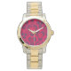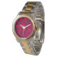 Este reloj tiene un diseño geométrico de hexágonos en conjuntos de tres que parecen flores en magenta y morado.