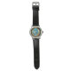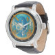 This image is a circular watch with a black rim and white numbers. The watch face features a whimsical illustration of a blue narwhal with a golden tusk, wearing snorkeling goggles and reading a newspaper titled "NARWHAL TIMES" while sitting on a toilet underwater. The underwater scene includes blue tiled walls, seaweed, starfish, and a seahorse, with bubbles floating around the narwhal, all contained within a golden inner frame.