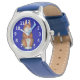 Este original reloj azul de moda para los niños tiene el ilustracion de un lindo conejo marrón en la cara del reloj, el conejo se ve genial en el fondo azul de la cara del reloj y los números blancos son lo suficientemente atrevidos para que cualquiera lo vea. Este reloj de moda también tiene una correa azul a juego. Este conejito cariñosamente está sosteniendo un montón de flores coloridas y tiene una sonrisa feliz en su cara. El ilustracion de conejo marrón dulce se ve muy bien en este reloj de niños y se acompaña de niños de todas las edades. A cualquier niño le encantará este lindo y genial pedazo de tiempo de conejito. El original cuadro del conejito está pintado en color agua