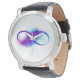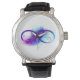 Símbolo infinito con una hermosa pluma pintada de color violeta y azul brillante sobre fondo blanco.