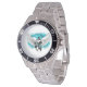 A beautiful watch with a very nice design. Two large white wings with angels, airplane, and a flight attendant upon the earth with a background blue sky.