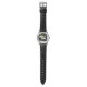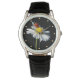 Un reloj de pulsera divertido con la foto de una margarita con una mariquita en el fondo negro con puntos amarillos durante horas.