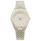 Este reloj de mujeres se muestra en los dos tonos plateado y dorado y tiene una pequeña corona de color oro a las 12:00, un rostro puro de Beige con marcas de Oro y un texto de "Las familias son para siempre" Personalizar este reloj o compra tal como está.