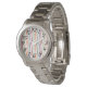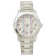 Este reloj femenino tiene un diseño moderno de mediados de siglo de repetición de rectángulos en verde azulado, naranja, remolacha y naranja en un campo de blanco. Si te gusta el diseño pero prefieres colores diferentes, envíame un mensaje.