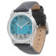 Este reloj masculino tiene un diseño geométrico de un gran rectángulo verde azulado en la esquina superior izquierda, rayas verde azuladas más oscuras en la esquina superior derecha, un rectángulo verde azulado más pequeño más ligero debajo de las rayas y líneas negras en la parte inferior. Si te gusta el diseño pero prefieres colores diferentes, envíame un mensaje.