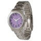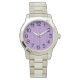 Este reloj femenino tiene un diseño Art Deco que se parece a un circuito. Las líneas se están ejecutando verticalmente en verde azulado sobre un campo morado. ¿Quieres un color diferente? Mándame un mensaje.