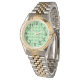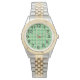 Este reloj femenino tiene un diseño moderno de mediados de siglo de líneas verticales verdes con rectángulos arriba, repetidos a lo largo del diseño.