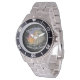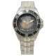 Lion Papercut Stainless Steel Watch. A rugged, adventure-ready timepiece featuring detailed papercut art of a roaring lion at ocean sunrise on its dial. Built with a full stainless steel case and band, adjustable bezel, and 100m water resistance. Combines bold style with Japanese quartz precision. Customize with your text.