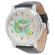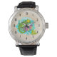 Un reloj con un bonito ilustracion de un lagarto tropical verde rodeado de hojas y flores de un color azul turquesa.