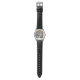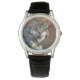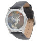 Un reloj clásico de correa de cuero negro para hombres se muestra con una foto de un lobo salvaje. Elija este reloj de varios estilos. Personalizar este reloj o compra como está. Imagen de stock