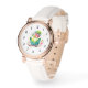 Un reloj con un lindo ilustracion de loro. Un pequeño loro verde con colores azules y amarillos que se mezclan. El cuello tiene una vibrante sombra de rosa rojizo.