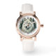 Esta imagen muestra un hermoso reloj de pulsera con un impactante ilustracion de la cabeza de un lobo en la cara del reloj. El reloj tiene un funda de oro rosa y una correa de cuero blanco que le dan un toque de elegancia al diseño de un lobo escarpado. Los números del dial se encuentran en un tipo de letra serif clásico, lo que aumenta el sofisticado aspecto general. Este reloj combina la belleza salvaje de la naturaleza con la artesanía refinada, lo que lo convierte en un accesorio único para los que aprecian tanto el estilo como el gran exterior.