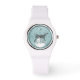 Hermoso reloj de mapa de la Tierra plana de las damas en el "mar" turquesa con el anillo blanco 'hielo del sur' y el bisel blanco 'polar', manos de hora y minutos y correa. La imagen representa la luz y el movimiento del sol alrededor de la superficie plana de la Tierra y los continentes mundiales. Disponible en Banda Black o White Watch.