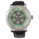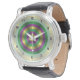Si te gusta el Mardi Gras, este diseño será genial para ti. Los tonos verdes, dorados y violetas están dispuestos en anillos que van de la oscuridad a la luz, lo que da al círculo un aspecto 3D. Este reloj está disponible en una variedad de tamaños y estilos, incluyendo niños y adultos.