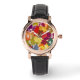 Este reloj femenino tiene un diseño de un montón de hojas en verde, amarillo, naranja, azul, marrón y rojo en un campo de amarillo pálido.