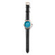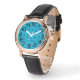 Este reloj femenino tiene un diseño moderno de mediados de siglo de mazas dispersas en un campo turquesa.