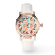 Este reloj femenino tiene un diseño moderno de mediados de siglo de círculos concéntricos en oro, naranja y turquesa sobre un fondo blanco.