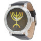 Una representación digital de la menorah judía de siete ramas (hebreo: מְ נ וֹ רָ ). La menorah de siete ramas, utilizada en el santuario portátil establecido por Moisés en el desierto y más tarde en el Templo en Jerusalén, ha sido un símbolo del judaísmo desde la antigüedad y es el emblema del escudo de armas del estado moderno de Israel. El kohanim encendió la menorah en el Santuario todas las noches y la limpiaba todas las mañanas, reemplazando las mechas y poniendo aceite de oliva fresco en las tazas. Se ha dicho que la menorah es un símbolo de la nación de Israel y que nuestra misión es ser "una luz para las naciones" (Isaías 42:6). Nuestros sabios subrayan que la luz no es una fuerza violenta; Israel debe cumplir su misión dando ejemplo, no utilizando la fuerza. Esta idea se destaca en la visión de Zechariah 4:1-6. Zacarías ve una menorah, y G-d explica: "No por la fuerza, ni por el poder, sino por mi espíritu". G-d reveló el diseño de la menorah a Moisés como sigue (Éxodo 25:31-40): 31 Y debes hacer una lámpara de oro puro. De trabajo martillado se hará la lámpara. Su base, sus ramas, sus tazas, sus pechos y sus flores van a salir de ella. 32 Y se están agotando seis ramas de sus lados, tres ramas del paro de su lado y tres ramas del paro de su otro lado. 33 Tres tazas en forma de flores de almendros se encuentran en un conjunto de ramas, alternando los pechos y las flores, y tres tazas en forma de flores de almendro en el otro conjunto de ramas, alternando los pechos y los flores. Así es con las seis ramas que se están saliendo del lampstand. 34 Y sobre el paraguas hay cuatro tazas en forma de flores de almendras, con sus pechos y sus flores alternando. 35 Y la perilla debajo de dos ramas está fuera de ella, y la perilla debajo de las otras dos ramas está fuera de ella, y la perilla debajo de dos ramas más está fuera, porque las seis ramas salen corriendo del parabrisas. 36 Sus perillas y sus ramas procederán de ella. Todo es una pieza de trabajo martillo, de oro puro. 37 Y hay que hacer siete lámparas para ello, y las lámparas deben iluminarse, y deben brillar sobre la parte de delante. 38 Y sus arcas y sus tenedores de fuego son de oro puro. 39 De un talento de oro puro, él lo hará con todos estos utensilios. 40 Y veis que los hacéis después de su patrón que os fue mostrado en la montaña. Hasta 2009, la primera representación preservada de la menorah del Templo fue representada en un friso en el Arco de Titus, conmemorando su desfile triunfal en Roma después de la destrucción de Jerusalén en el año 70. Sin embargo, en 2009, las ruinas de una sinagoga con cerámica que databa de antes de la destrucción del Segundo Templo fueron descubiertas bajo tierra en Magdala, propiedad de los Legionarios de Cristo, que tenían la intención de construir un centro de estudios para mujeres. En el interior de las ruinas de la sinagoga se descubrió una piedra rectangular, que tenía en su superficie, entre otras tallaciones ornamentales, una representación de la menorah de siete ramificaciones que difería marcadamente de la representación en el Arco de Titus, probablemente tallada por un testigo presencial a la menorah real presente en el Templo en Jerusalén. Esta menorah tiene brazos que son poligonales, no redondeados, y la base no es graduada sino triangular. Se han encontrado representaciones de los siete objetos ramificados en tumbas y monumentos del siglo I como símbolo frecuentemente utilizado del judaísmo y del pueblo judío. Contrariamente a algunos diseños modernos, la antigua menorah no contenía nada que se pareciera a siete velas ya que no existían en ese entonces.