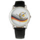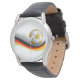 El reloj clásico de correa de cuero negro para hombres se muestra con una imagen gráfica de una pelota de fútbol. Elija este reloj de varios estilos. Personalizar este reloj o compra como está.