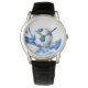 El reloj clásico de correa de cuero negro para hombres se muestra con una imagen gráfica de una pelota de fútbol. Elija este reloj de varios estilos. Personalizar este reloj o compra como está.