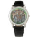 Men's classic black leather strap watch shown with a wildlife exotic tiger photo print.