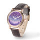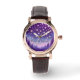Bonito reloj de pulsera en tonos violeta y rosa, con una escena natural con un cielo estrellado como motivo. El texto dice "Alcanzar las estrellas" y por supuesto puedes cambiar el texto a otra cosa, como un nombre, para hacer personal.