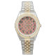 Este reloj masculino tiene un diseño geométrico de triángulos rojos y rojos profundos repitiendo con círculos verdes sobre un campo de blanco roto. ¿Quieres el mismo diseño en colores diferentes? Mándame un mensaje.