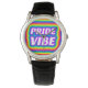 Celebra la diversidad y la inclusión con este diseño vibrante que presenta "PrideVibe" rodeado de un espectro de colores arcoiris. Los tonos radiantes contrastan maravillosamente con la elegante correa de cuero negro, creando una audaz declaración que encarna unidad, amor e individualidad. Perfecto para exhibir su Orgullo todo el año con un reloj de pulsera de diseño y colorido.