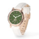 personalized watch, green dial, gold watch, white leather strap, elegant wristwatch, monogram gift, luxury accessory, custom initials, stylish design, timeless fashion