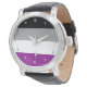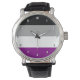 La bandera asexual del orgullo consiste en cuatro bandas horizontales: negro, gris, blanco y morado de arriba a abajo. La bandera fue creada por el usuario de AVEN standup en agosto de 2010, como parte de un esfuerzo comunitario para crear y elegir una bandera. La franja negra representa la asexualidad; la franja gris representa los acios grises y los demisexuales; la franja blanca representa a los aliados; y la franja morada representa a la comunidad.