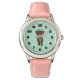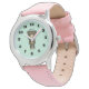 Un reloj de un niño con un simple ilustracion personalizado de un oso marrón sosteniendo una margarita amarilla. Hola escrito sobre su cabeza.
