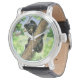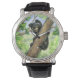 Un atrevido oso cachorro cuelga de una extremidad de árbol en el bosque. Acuarela y gouache de Amanda Diehl