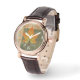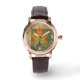 Perfecto reloj de correa cuadrada de cuero marrón cuadrado de las mujeres con una imagen de una hoja de arce verde, naranja y amarillo sobre verde edredado y marrón. Vea el encanto cuadrado coincidente, la cadena de teclas metalizado de gran tamaño cuadrado premium y la cadena de teclas acrílicas cuadradas de doble cara. Vea toda la colección de Acción de Gracias de la categoría ACCESORIOS en la sección VACACIONES.