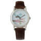 Pájaro azul en rama de flor rosa. Reloj de cuero marrón con cara redonda.