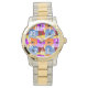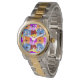 Este reloj femenino tiene un diseño de primavera morado, azul, naranja y rojo con paneles amarillos en una capa de amarillo.