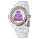 Un bonito diseño con un pastel de tres niveles de boda morado con acentos florales.