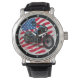 This watch face prominently features a dark-colored cruiser motorcycle against a vibrant, waving American flag background. The motorcycle has subtle blue accents, matching the flag's colors. The design captures a sense of freedom and patriotism, with clear white watch hands and numbers for easy time reading.