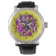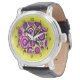Moda retro muy sencilla y moderna de formas circulares en tonos rosa, naranja, morado y blanco sobre un fondo de neón amarillo. Creado en ArtRage 3 Studio Pro, con plantillas y capas, por Gina Lee Manley ©gleem Usted elige estilo de reloj y color de pulsera.