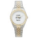 Estilo: Unisex reloj de pulsera de dos tonos Perfecto para el uso diario, este reloj de dos tonalidades dorado y plateado se puede personalizar para que coincida con tu estilo. Añade tus diseños y textos favoritos al personalizar para una declaración de estilo increíble. Material: Strap: Funda de aleación: Dimensiones de aleación: Cara: 1.16" de diámetro Correa: 7.99" x 0.31" Funda: 1.37" de diámetro Peso: 0.148 lb analógico de 3 manos Japón Cuartz® Impresión a color completo en la cara Doble seguro sobre cierre de cerradura Resistencia de agua: Hasta 3 ATM (98.4 ft) 1 año de garantía limitada de los fabricantes Batería incluida Este producto se recomienda para mayores de 13 años