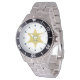 Este reloj está decorado con la insignia de seis puntas del sheriff de oro y puede ser personalizado con un nombre.