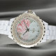 The design is set within a crystal-accented metal bezel and paired with a glossy white enamel alloy bracelet, creating a look that is feminine, graceful, and effortlessly polished. Subtle gold-tone detailing on the dial adds warmth and balance, allowing the floral artwork to remain the focal point.